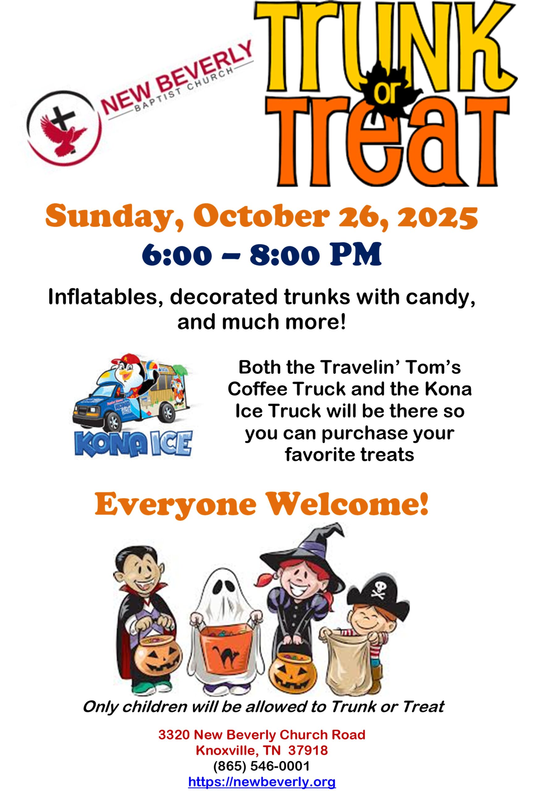Bring the family for an evening of fun at our Trunk or Treat on Sunday, October 26, 2025, from 6:00 PM until 8:00 PM. We will have inflatables, decorated trunks with candy, and much more! Both the Travelin’ Tom’s Coffee Truck and Kona Ice Truck will be there so you can purchase your favorite treats.